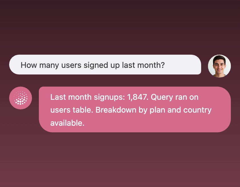 Give users instant answers based on your live data. Jet AI respects permissions and connects directly to your databases and APIs.